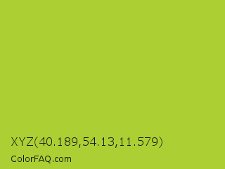 XYZ 40.189,54.13,11.579 Color is a normal lime color and the nearest color is Android Green #a4c639. Hex code #acd034 and RGB value is rgb(172,208,52). In RGB color space, this color is composed of 67% red, 82% green, 20% blue, In CMYK color space, this color is composed of 17% cyan, 0% magenta, 75% yellow , 18% black , In HSL color space, this color has a hue angle of 74° , 62% saturation and 51% lightness.