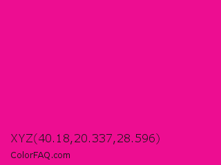 XYZ 40.18,20.337,28.596 Color is a normal magenta color and the nearest color is Fluorescent Pink #ff1493. Hex code #ed0d91 and RGB value is rgb(237,13,145). In RGB color space, this color is composed of 93% red, 5% green, 57% blue, In CMYK color space, this color is composed of 0% cyan, 95% magenta, 39% yellow , 7% black , In HSL color space, this color has a hue angle of 325° , 90% saturation and 49% lightness.
