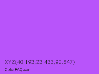 XYZ 40.193,23.433,92.847 Color is a light purple color and the nearest color is Medium Orchid #ba55d3. Hex code #b854fa and RGB value is rgb(184,84,250). In RGB color space, this color is composed of 72% red, 33% green, 98% blue, In CMYK color space, this color is composed of 26% cyan, 66% magenta, 0% yellow , 2% black , In HSL color space, this color has a hue angle of 276° , 94% saturation and 65% lightness.