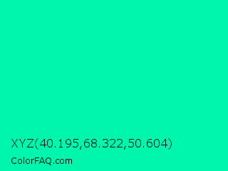 XYZ 40.195,68.322,50.604 Color is a normal green color and the nearest color is Medium Spring Green #00fa9a. Hex code #00f5ad and RGB value is rgb(0,245,173). In RGB color space, this color is composed of 0% red, 96% green, 68% blue, In CMYK color space, this color is composed of 100% cyan, 0% magenta, 29% yellow , 4% black , In HSL color space, this color has a hue angle of 162° , 100% saturation and 48% lightness.