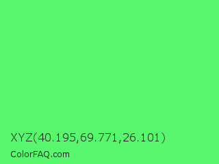 XYZ 40.195,69.771,26.101 Color is a light green color and the nearest color is Screamin Green #66ff66. Hex code #59f76e and RGB value is rgb(89,247,110). In RGB color space, this color is composed of 35% red, 97% green, 43% blue, In CMYK color space, this color is composed of 64% cyan, 0% magenta, 55% yellow , 3% black , In HSL color space, this color has a hue angle of 128° , 91% saturation and 66% lightness.