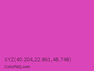 XYZ 40.204,22.861,48.748 Color is a normal magenta color and the nearest color is Frostbite #e936a7. Hex code #db45ba and RGB value is rgb(219,69,186). In RGB color space, this color is composed of 86% red, 27% green, 73% blue, In CMYK color space, this color is composed of 0% cyan, 68% magenta, 15% yellow , 14% black , In HSL color space, this color has a hue angle of 313° , 68% saturation and 56% lightness.