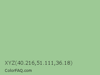 XYZ 40.216,51.111,36.18 Color is a light green color and the nearest color is Eton Blue #96c8a2. Hex code #9dc995 and RGB value is rgb(157,201,149). In RGB color space, this color is composed of 62% red, 79% green, 58% blue, In CMYK color space, this color is composed of 22% cyan, 0% magenta, 26% yellow , 21% black , In HSL color space, this color has a hue angle of 111° , 33% saturation and 69% lightness.