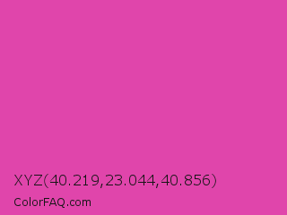 XYZ 40.219,23.044,40.856 Color is a normal magenta color and the nearest color is Frostbite #e936a7. Hex code #e045ab and RGB value is rgb(224,69,171). In RGB color space, this color is composed of 88% red, 27% green, 67% blue, In CMYK color space, this color is composed of 0% cyan, 69% magenta, 24% yellow , 12% black , In HSL color space, this color has a hue angle of 321° , 71% saturation and 57% lightness.