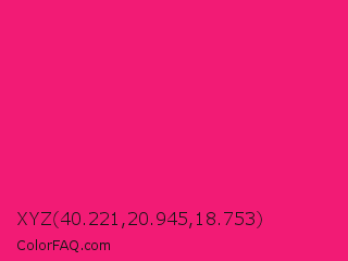 XYZ 40.221,20.945,18.753 Color is a normal rose color and the nearest color is Razzmatazz #e3256b. Hex code #f21b75 and RGB value is rgb(242,27,117). In RGB color space, this color is composed of 95% red, 11% green, 46% blue, In CMYK color space, this color is composed of 0% cyan, 89% magenta, 52% yellow , 5% black , In HSL color space, this color has a hue angle of 335° , 89% saturation and 53% lightness.