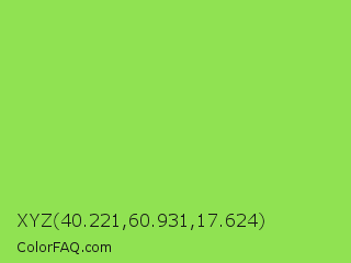 XYZ 40.221,60.931,17.624 Color is a normal green color and the nearest color is Kiwi #8ee53f. Hex code #90e252 and RGB value is rgb(144,226,82). In RGB color space, this color is composed of 56% red, 89% green, 32% blue, In CMYK color space, this color is composed of 36% cyan, 0% magenta, 64% yellow , 11% black , In HSL color space, this color has a hue angle of 94° , 71% saturation and 60% lightness.
