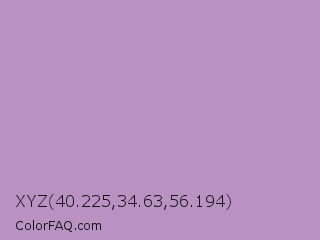XYZ 40.225,34.63,56.194 Color is a light purple color and the nearest color is African Violet #b284be. Hex code #ba91c3 and RGB value is rgb(186,145,195). In RGB color space, this color is composed of 73% red, 57% green, 76% blue, In CMYK color space, this color is composed of 5% cyan, 26% magenta, 0% yellow , 24% black , In HSL color space, this color has a hue angle of 289° , 29% saturation and 67% lightness.