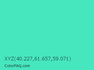 XYZ 40.227,61.657,59.071 Color is a normal cyan color and the nearest color is Turquoise #40e0d0. Hex code #46e6bf and RGB value is rgb(70,230,191). In RGB color space, this color is composed of 27% red, 90% green, 75% blue, In CMYK color space, this color is composed of 70% cyan, 0% magenta, 17% yellow , 10% black , In HSL color space, this color has a hue angle of 165° , 76% saturation and 59% lightness.