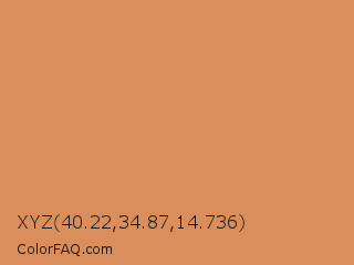 XYZ 40.22,34.87,14.736 Color is a light orange color and the nearest color is Persian Orange #d99058. Hex code #d98e5c and RGB value is rgb(217,142,92). In RGB color space, this color is composed of 85% red, 56% green, 36% blue, In CMYK color space, this color is composed of 0% cyan, 35% magenta, 58% yellow , 15% black , In HSL color space, this color has a hue angle of 24° , 62% saturation and 61% lightness.
