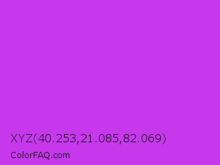 XYZ 40.253,21.085,82.069 Color is a normal purple color and the nearest color is Steel Pink #cc33cc. Hex code #c738ed and RGB value is rgb(199,56,237). In RGB color space, this color is composed of 78% red, 22% green, 93% blue, In CMYK color space, this color is composed of 16% cyan, 76% magenta, 0% yellow , 7% black , In HSL color space, this color has a hue angle of 287° , 83% saturation and 57% lightness.