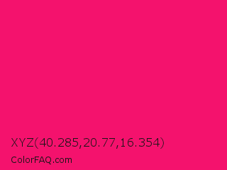 XYZ 40.285,20.77,16.354 Color is a normal rose color and the nearest color is Vivid Raspberry #ff006c. Hex code #f4126d and RGB value is rgb(244,18,109). In RGB color space, this color is composed of 96% red, 7% green, 43% blue, In CMYK color space, this color is composed of 0% cyan, 93% magenta, 55% yellow , 4% black , In HSL color space, this color has a hue angle of 336° , 91% saturation and 51% lightness.