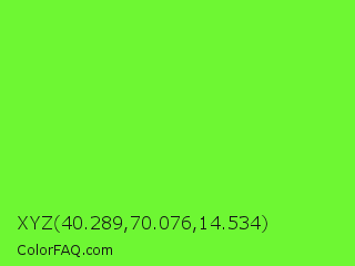 XYZ 40.289,70.076,14.534 Color is a normal green color and the nearest color is Spring Frost #87ff2a. Hex code #6ef733 and RGB value is rgb(110,247,51). In RGB color space, this color is composed of 43% red, 97% green, 20% blue, In CMYK color space, this color is composed of 55% cyan, 0% magenta, 79% yellow , 3% black , In HSL color space, this color has a hue angle of 102° , 92% saturation and 58% lightness.