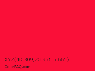 XYZ 40.309,20.951,5.661 Color is a normal red color and the nearest color is Torch Red #fd0e35. Hex code #fa0f38 and RGB value is rgb(250,15,56). In RGB color space, this color is composed of 98% red, 6% green, 22% blue, In CMYK color space, this color is composed of 0% cyan, 94% magenta, 78% yellow , 2% black , In HSL color space, this color has a hue angle of 350° , 96% saturation and 52% lightness.
