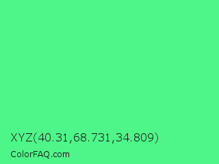 XYZ 40.31,68.731,34.809 Color is a light green color and the nearest color is Very Light Malachite Green #64e986. Hex code #4ef589 and RGB value is rgb(78,245,137). In RGB color space, this color is composed of 31% red, 96% green, 54% blue, In CMYK color space, this color is composed of 68% cyan, 0% magenta, 44% yellow , 4% black , In HSL color space, this color has a hue angle of 141° , 89% saturation and 63% lightness.