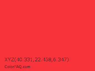 XYZ 40.331,22.458,6.347 Color is a normal red color and the nearest color is Deep Carmine Pink #ef3038. Hex code #f7333b and RGB value is rgb(247,51,59). In RGB color space, this color is composed of 97% red, 20% green, 23% blue, In CMYK color space, this color is composed of 0% cyan, 79% magenta, 76% yellow , 3% black , In HSL color space, this color has a hue angle of 358° , 92% saturation and 58% lightness.