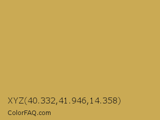 XYZ 40.332,41.946,14.358 Color is a normal orange color and the nearest color is Roti #c6a84b. Hex code #caaa54 and RGB value is rgb(202,170,84). In RGB color space, this color is composed of 79% red, 67% green, 33% blue, In CMYK color space, this color is composed of 0% cyan, 16% magenta, 58% yellow , 21% black , In HSL color space, this color has a hue angle of 44° , 53% saturation and 56% lightness.
