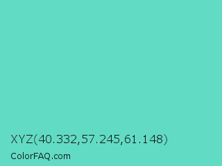 XYZ 40.332,57.245,61.148 Color is a light cyan color and the nearest color is Downy #6fd0c5. Hex code #62dbc4 and RGB value is rgb(98,219,196). In RGB color space, this color is composed of 38% red, 86% green, 77% blue, In CMYK color space, this color is composed of 55% cyan, 0% magenta, 11% yellow , 14% black , In HSL color space, this color has a hue angle of 169° , 63% saturation and 62% lightness.