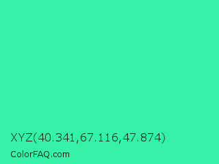 XYZ 40.341,67.116,47.874 Color is a normal green color and the nearest color is Eucalyptus #44d7a8. Hex code #36f2a8 and RGB value is rgb(54,242,168). In RGB color space, this color is composed of 21% red, 95% green, 66% blue, In CMYK color space, this color is composed of 78% cyan, 0% magenta, 31% yellow , 5% black , In HSL color space, this color has a hue angle of 156° , 88% saturation and 58% lightness.