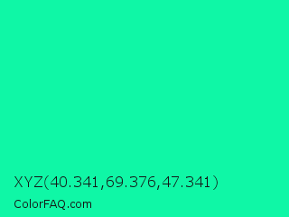 XYZ 40.341,69.376,47.341 Color is a normal green color and the nearest color is Medium Spring Green #00fa9a. Hex code #0ff7a6 and RGB value is rgb(15,247,166). In RGB color space, this color is composed of 6% red, 97% green, 65% blue, In CMYK color space, this color is composed of 94% cyan, 0% magenta, 33% yellow , 3% black , In HSL color space, this color has a hue angle of 159° , 94% saturation and 51% lightness.