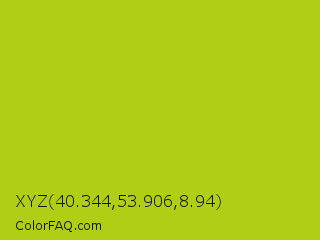 XYZ 40.344,53.906,8.94 Color is a normal yellow color and the nearest color is Bahia #a5cb0c. Hex code #b0cf14 and RGB value is rgb(176,207,20). In RGB color space, this color is composed of 69% red, 81% green, 8% blue, In CMYK color space, this color is composed of 15% cyan, 0% magenta, 90% yellow , 19% black , In HSL color space, this color has a hue angle of 70° , 82% saturation and 45% lightness.