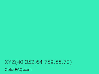 XYZ 40.352,64.759,55.72 Color is a normal green color and the nearest color is Turquoise PWG #30d5c8. Hex code #34edb8 and RGB value is rgb(52,237,184). In RGB color space, this color is composed of 20% red, 93% green, 72% blue, In CMYK color space, this color is composed of 78% cyan, 0% magenta, 22% yellow , 7% black , In HSL color space, this color has a hue angle of 163° , 84% saturation and 57% lightness.