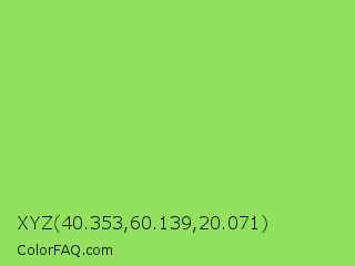 XYZ 40.353,60.139,20.071 Color is a light green color and the nearest color is Kiwi #8ee53f. Hex code #91e05e and RGB value is rgb(145,224,94). In RGB color space, this color is composed of 57% red, 88% green, 37% blue, In CMYK color space, this color is composed of 35% cyan, 0% magenta, 58% yellow , 12% black , In HSL color space, this color has a hue angle of 96° , 68% saturation and 62% lightness.
