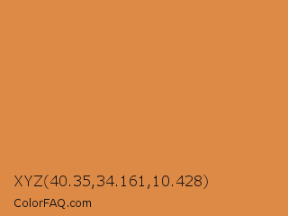 XYZ 40.35,34.161,10.428 Color is a normal orange color and the nearest color is Tigers Eye #e08d3c. Hex code #de8a47 and RGB value is rgb(222,138,71). In RGB color space, this color is composed of 87% red, 54% green, 28% blue, In CMYK color space, this color is composed of 0% cyan, 38% magenta, 68% yellow , 13% black , In HSL color space, this color has a hue angle of 27° , 70% saturation and 57% lightness.