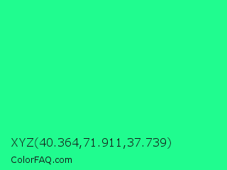 XYZ 40.364,71.911,37.739 Color is a normal green color and the nearest color is Medium Spring Green #00fa9a. Hex code #20fc8f and RGB value is rgb(32,252,143). In RGB color space, this color is composed of 13% red, 99% green, 56% blue, In CMYK color space, this color is composed of 87% cyan, 0% magenta, 43% yellow , 1% black , In HSL color space, this color has a hue angle of 150° , 97% saturation and 56% lightness.