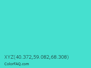 XYZ 40.372,59.082,68.308 Color is a normal cyan color and the nearest color is Turquoise #40e0d0. Hex code #45e0cf and RGB value is rgb(69,224,207). In RGB color space, this color is composed of 27% red, 88% green, 81% blue, In CMYK color space, this color is composed of 69% cyan, 0% magenta, 8% yellow , 12% black , In HSL color space, this color has a hue angle of 173° , 71% saturation and 57% lightness.