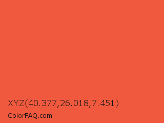 XYZ 40.377,26.018,7.451 Color is a normal red color and the nearest color is Orange Soda #fa5b3d. Hex code #f0593e and RGB value is rgb(240,89,62). In RGB color space, this color is composed of 94% red, 35% green, 24% blue, In CMYK color space, this color is composed of 0% cyan, 63% magenta, 74% yellow , 6% black , In HSL color space, this color has a hue angle of 9° , 86% saturation and 59% lightness.