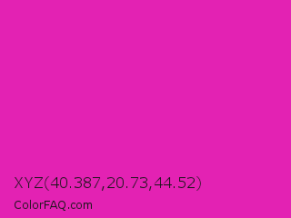 XYZ 40.387,20.73,44.52 Color is a normal magenta color and the nearest color is Frostbite #e936a7. Hex code #e322b3 and RGB value is rgb(227,34,179). In RGB color space, this color is composed of 89% red, 13% green, 70% blue, In CMYK color space, this color is composed of 0% cyan, 85% magenta, 21% yellow , 11% black , In HSL color space, this color has a hue angle of 315° , 78% saturation and 51% lightness.