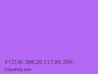 XYZ 40.388,26.117,89.299 Color is a light purple color and the nearest color is Lavender #b57edc. Hex code #b567f5 and RGB value is rgb(181,103,245). In RGB color space, this color is composed of 71% red, 40% green, 96% blue, In CMYK color space, this color is composed of 26% cyan, 58% magenta, 0% yellow , 4% black , In HSL color space, this color has a hue angle of 273° , 88% saturation and 68% lightness.