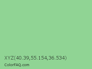 XYZ 40.39,55.154,36.534 Color is a light green color and the nearest color is Granny Smith Apple Crayola #9de093. Hex code #90d494 and RGB value is rgb(144,212,148). In RGB color space, this color is composed of 56% red, 83% green, 58% blue, In CMYK color space, this color is composed of 32% cyan, 0% magenta, 30% yellow , 17% black , In HSL color space, this color has a hue angle of 124° , 44% saturation and 70% lightness.