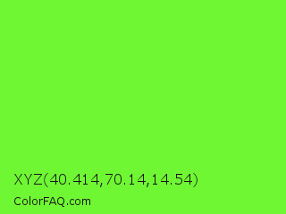 XYZ 40.414,70.14,14.54 Color is a normal green color and the nearest color is Spring Frost #87ff2a. Hex code #6ff733 and RGB value is rgb(111,247,51). In RGB color space, this color is composed of 44% red, 97% green, 20% blue, In CMYK color space, this color is composed of 55% cyan, 0% magenta, 79% yellow , 3% black , In HSL color space, this color has a hue angle of 102° , 92% saturation and 58% lightness.
