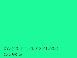 XYZ 40.414,70.918,41.695 Color is a normal green color and the nearest color is Medium Spring Green #00fa9a. Hex code #1cfa99 and RGB value is rgb(28,250,153). In RGB color space, this color is composed of 11% red, 98% green, 60% blue, In CMYK color space, this color is composed of 89% cyan, 0% magenta, 39% yellow , 2% black , In HSL color space, this color has a hue angle of 154° , 96% saturation and 55% lightness.