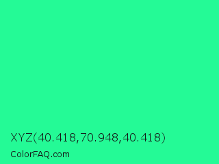 XYZ 40.418,70.948,40.418 Color is a normal green color and the nearest color is Medium Spring Green #00fa9a. Hex code #24fa96 and RGB value is rgb(36,250,150). In RGB color space, this color is composed of 14% red, 98% green, 59% blue, In CMYK color space, this color is composed of 86% cyan, 0% magenta, 40% yellow , 2% black , In HSL color space, this color has a hue angle of 152° , 96% saturation and 56% lightness.