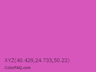 XYZ 40.429,24.733,50.22 Color is a normal magenta color and the nearest color is Fuchsia Pink #c154c1. Hex code #d756bc and RGB value is rgb(215,86,188). In RGB color space, this color is composed of 84% red, 34% green, 74% blue, In CMYK color space, this color is composed of 0% cyan, 60% magenta, 13% yellow , 16% black , In HSL color space, this color has a hue angle of 313° , 62% saturation and 59% lightness.