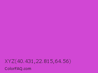 XYZ 40.431,22.815,64.56 Color is a normal magenta color and the nearest color is Steel Pink #cc33cc. Hex code #d147d4 and RGB value is rgb(209,71,212). In RGB color space, this color is composed of 82% red, 28% green, 83% blue, In CMYK color space, this color is composed of 1% cyan, 67% magenta, 0% yellow , 17% black , In HSL color space, this color has a hue angle of 299° , 62% saturation and 55% lightness.
