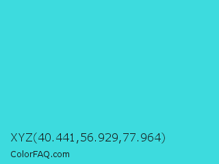 XYZ 40.441,56.929,77.964 Color is a normal cyan color and the nearest color is Turquoise #40e0d0. Hex code #3ddbde and RGB value is rgb(61,219,222). In RGB color space, this color is composed of 24% red, 86% green, 87% blue, In CMYK color space, this color is composed of 73% cyan, 1% magenta, 0% yellow , 13% black , In HSL color space, this color has a hue angle of 181° , 71% saturation and 55% lightness.