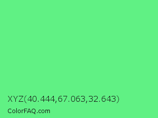 XYZ 40.444,67.063,32.643 Color is a light green color and the nearest color is Very Light Malachite Green #64e986. Hex code #60f184 and RGB value is rgb(96,241,132). In RGB color space, this color is composed of 38% red, 95% green, 52% blue, In CMYK color space, this color is composed of 60% cyan, 0% magenta, 45% yellow , 5% black , In HSL color space, this color has a hue angle of 135° , 84% saturation and 66% lightness.