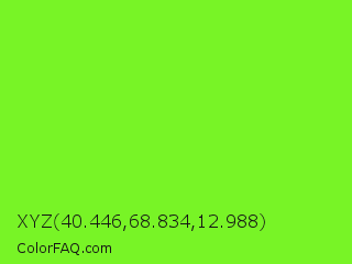 XYZ 40.446,68.834,12.988 Color is a normal green color and the nearest color is Spring Frost #87ff2a. Hex code #78f426 and RGB value is rgb(120,244,38). In RGB color space, this color is composed of 47% red, 96% green, 15% blue, In CMYK color space, this color is composed of 51% cyan, 0% magenta, 84% yellow , 4% black , In HSL color space, this color has a hue angle of 96° , 90% saturation and 55% lightness.