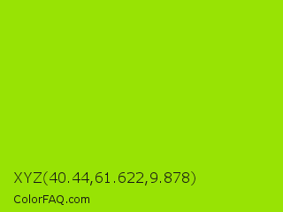 XYZ 40.44,61.622,9.878 Color is a normal green color and the nearest color is Sheen Green #8fd400. Hex code #98e304 and RGB value is rgb(152,227,4). In RGB color space, this color is composed of 60% red, 89% green, 2% blue, In CMYK color space, this color is composed of 33% cyan, 0% magenta, 98% yellow , 11% black , In HSL color space, this color has a hue angle of 80° , 97% saturation and 45% lightness.