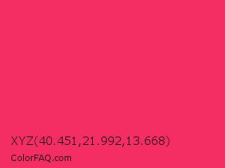 XYZ 40.451,21.992,13.668 Color is a normal rose color and the nearest color is Radical Red #ff355e. Hex code #f42d62 and RGB value is rgb(244,45,98). In RGB color space, this color is composed of 96% red, 18% green, 38% blue, In CMYK color space, this color is composed of 0% cyan, 82% magenta, 60% yellow , 4% black , In HSL color space, this color has a hue angle of 344° , 90% saturation and 57% lightness.
