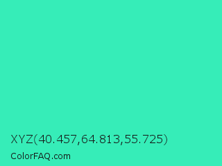 XYZ 40.457,64.813,55.725 Color is a normal green color and the nearest color is Turquoise #40e0d0. Hex code #36edb8 and RGB value is rgb(54,237,184). In RGB color space, this color is composed of 21% red, 93% green, 72% blue, In CMYK color space, this color is composed of 77% cyan, 0% magenta, 22% yellow , 7% black , In HSL color space, this color has a hue angle of 163° , 84% saturation and 57% lightness.
