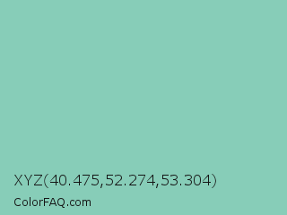XYZ 40.475,52.274,53.304 Color is a light green color and the nearest color is Vista Blue #8fd6b4. Hex code #87cdb8 and RGB value is rgb(135,205,184). In RGB color space, this color is composed of 53% red, 80% green, 72% blue, In CMYK color space, this color is composed of 34% cyan, 0% magenta, 10% yellow , 20% black , In HSL color space, this color has a hue angle of 162° , 41% saturation and 67% lightness.
