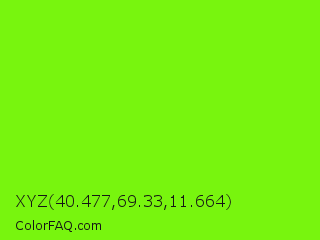 XYZ 40.477,69.33,11.664 Color is a normal green color and the nearest color is Lawn Green #7cfc00. Hex code #78f50e and RGB value is rgb(120,245,14). In RGB color space, this color is composed of 47% red, 96% green, 5% blue, In CMYK color space, this color is composed of 51% cyan, 0% magenta, 94% yellow , 4% black , In HSL color space, this color has a hue angle of 92° , 92% saturation and 51% lightness.