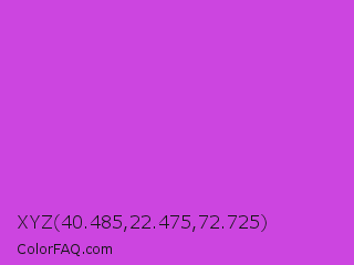 XYZ 40.485,22.475,72.725 Color is a normal magenta color and the nearest color is Steel Pink #cc33cc. Hex code #cc45e0 and RGB value is rgb(204,69,224). In RGB color space, this color is composed of 80% red, 27% green, 88% blue, In CMYK color space, this color is composed of 9% cyan, 69% magenta, 0% yellow , 12% black , In HSL color space, this color has a hue angle of 292° , 71% saturation and 57% lightness.