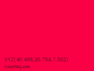 XYZ 40.499,20.754,7.502 Color is a normal rose color and the nearest color is Electric Crimson #ff003f. Hex code #fa0045 and RGB value is rgb(250,0,69). In RGB color space, this color is composed of 98% red, 0% green, 27% blue, In CMYK color space, this color is composed of 0% cyan, 100% magenta, 72% yellow , 2% black , In HSL color space, this color has a hue angle of 343° , 100% saturation and 49% lightness.
