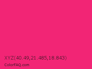 XYZ 40.49,21.485,18.843 Color is a normal rose color and the nearest color is Razzmatazz #e3256b. Hex code #f22575 and RGB value is rgb(242,37,117). In RGB color space, this color is composed of 95% red, 15% green, 46% blue, In CMYK color space, this color is composed of 0% cyan, 85% magenta, 52% yellow , 5% black , In HSL color space, this color has a hue angle of 337° , 89% saturation and 55% lightness.