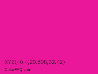 XYZ 40.4,20.608,32.42 Color is a normal magenta color and the nearest color is Fluorescent Pink #ff1493. Hex code #eb179a and RGB value is rgb(235,23,154). In RGB color space, this color is composed of 92% red, 9% green, 60% blue, In CMYK color space, this color is composed of 0% cyan, 90% magenta, 34% yellow , 8% black , In HSL color space, this color has a hue angle of 323° , 84% saturation and 51% lightness.